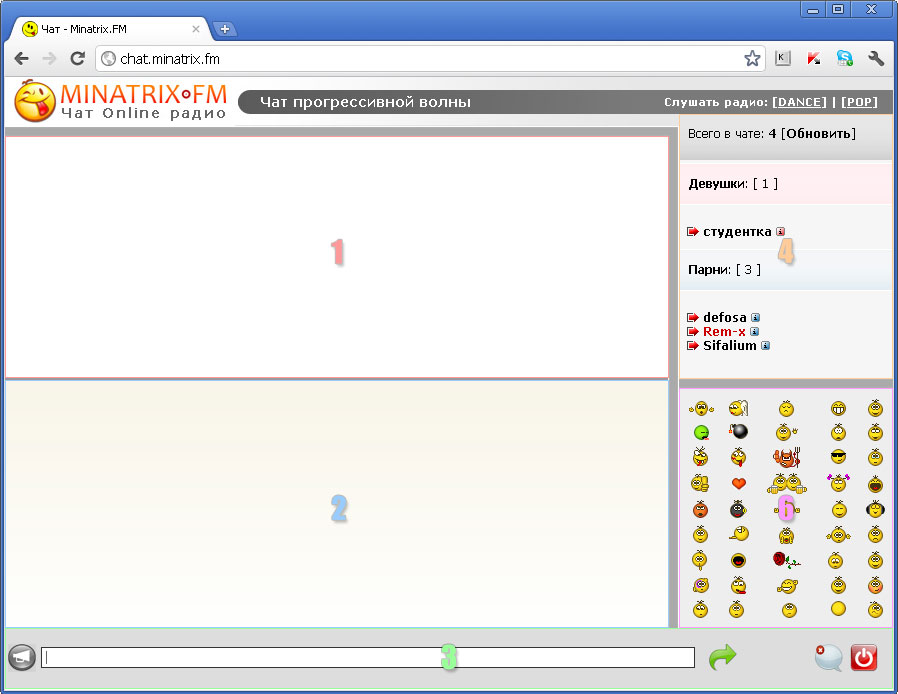 Вот изображение чата. Чат разделен на 6 частей: 1) Основное окно чата; 2) Приватное окно чата; 3) Строка ввода сообщения; 4) Список пользователей online; 5) Шапка чата (на рисунке не пронумеровано. Верхняя часть.); 6) Окно смайликов.